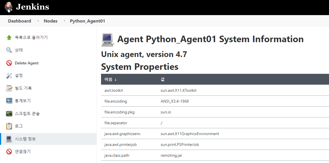 생성한 Python 에이전트의 속성을 Jenkins 에이전트로 등록에 적합하도록 변경해야 한다.