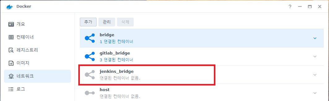 기존에 존재하던 네트워크 이름을 선택하고 삭제 버튼을 누르면 jenkins_bridge만 존재한다.