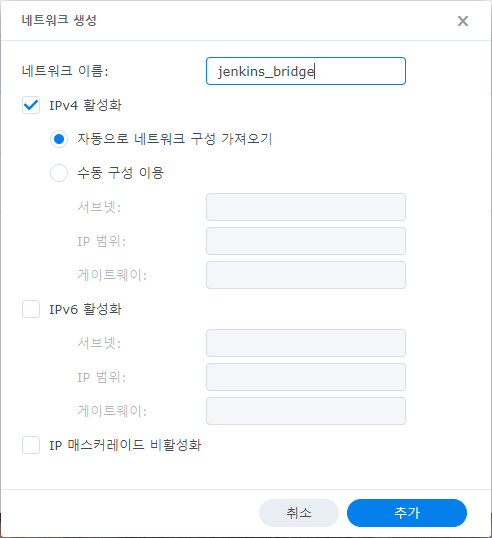 네트워크 이름은 Jenkins에서 사용할 것이므로 jenkins_bridge로 지정한다.