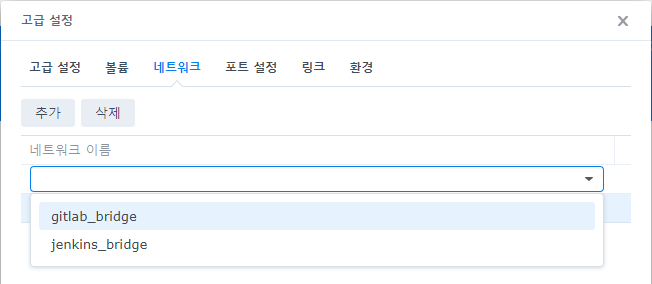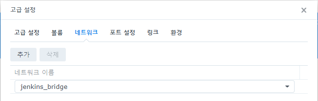 네트워크 탭을 클릭하고 네트워크 이름에서 jenkins_bridge를 선택한다.