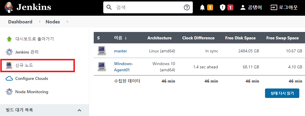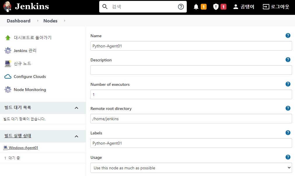 이제 모든 준비를 마쳤으므로 Jenkins에 해당 컨테이너를 에이전트로 등록한다.