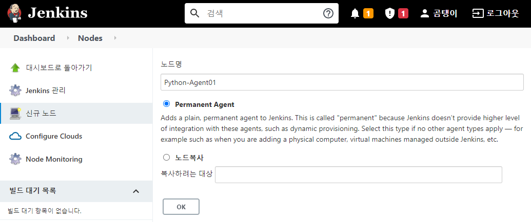노드명은 python-agent01로 입력하고, Permanent Agent에 체크하고 OK를 누른다.