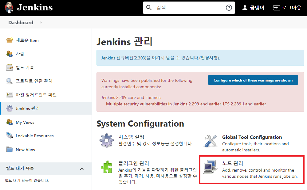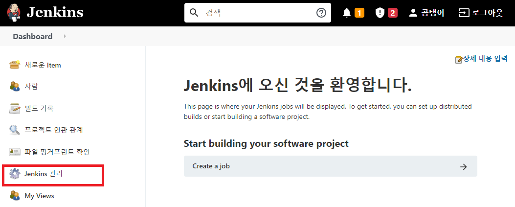 Jenkins 화면에서 Jenkins 관리를 클릭한다.