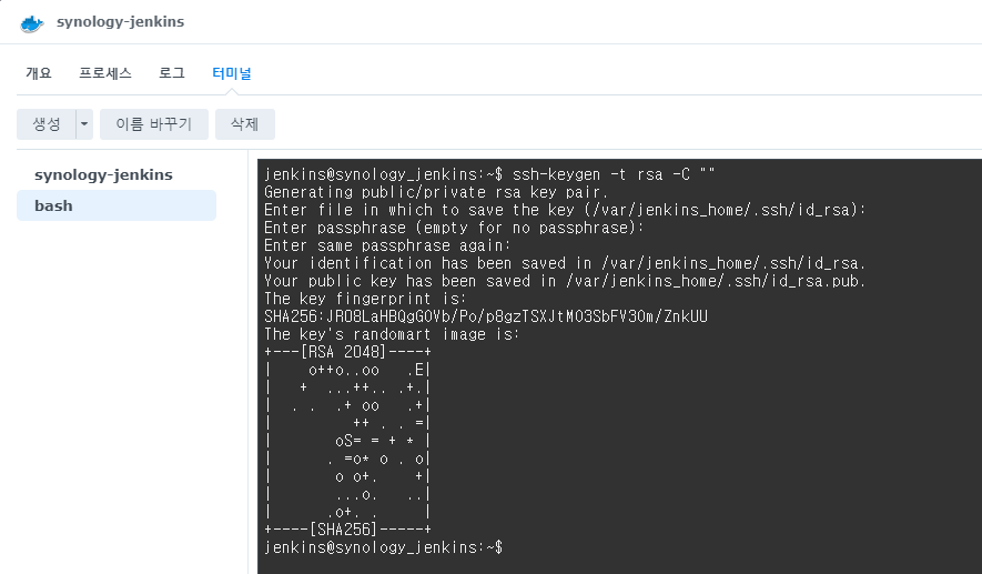 Jenkins Master Node 컨테이너가 정상적으로 생성되면, 해당 쉘에 접근하여 SSH Key를 생성한다.