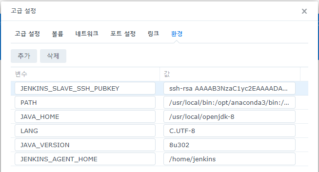 Jenkins Master 컨테이너에서 확인한 id_rsa.pub 파일의 값을 JENKINS_SLAVE_SSH_PUBKEY 환경 변수로 입력한다.
