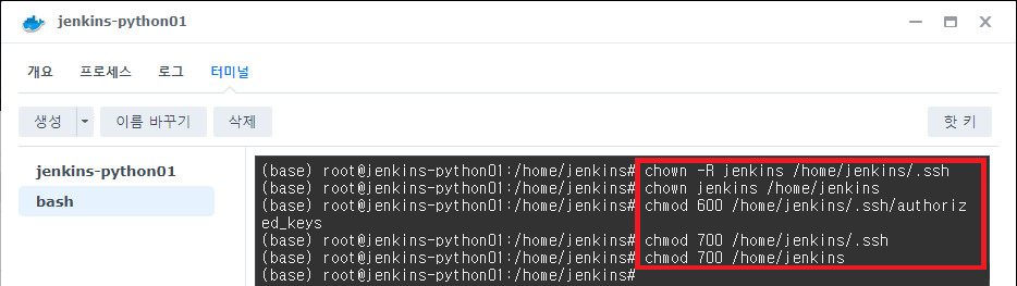 - /home/jenkins/.ssh 폴더의 접근 권한을 700 (rwx------)으로 변환한다.