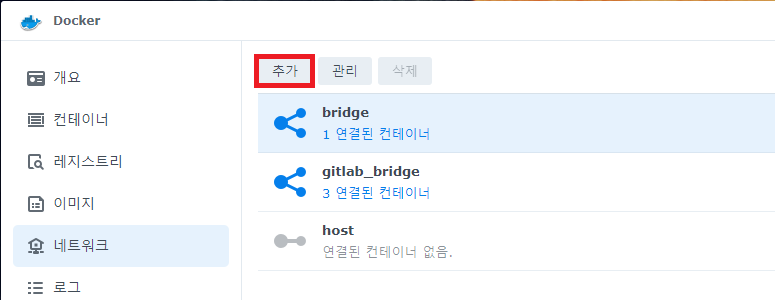 먼저 Synology NAS의 Docker 패키지를 실행하고 네트워크 탭을 선택한다.