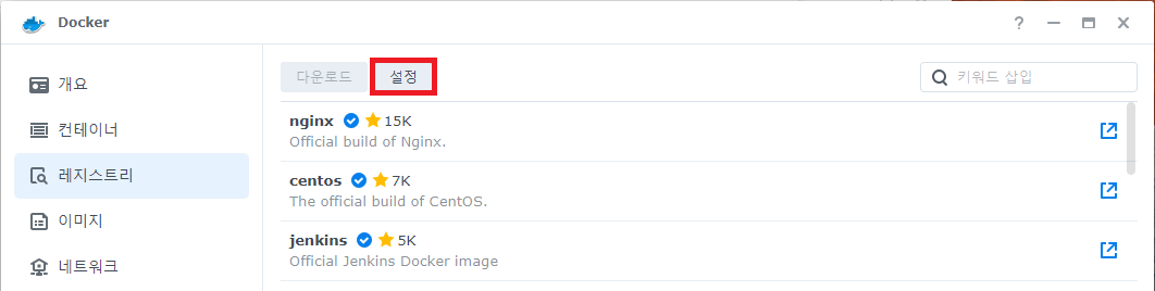 Docker 패키지 좌측의 레지스트리를 클릭하고, 상단의 설정을 클릭한다.
