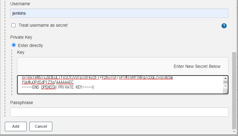 Jenkins Master 컨테이너의 /.ssh/id_rsa 값을 붙여넣기 한다.