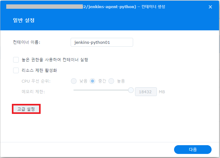 컨테이너 이름을 지정하고 고급 설정을 클릭한다.