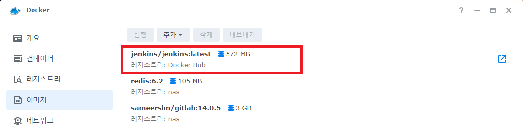 Docker 패키지의 이미지 탭에서 jenkins/jenkins:latest를 더블 클릭한다.