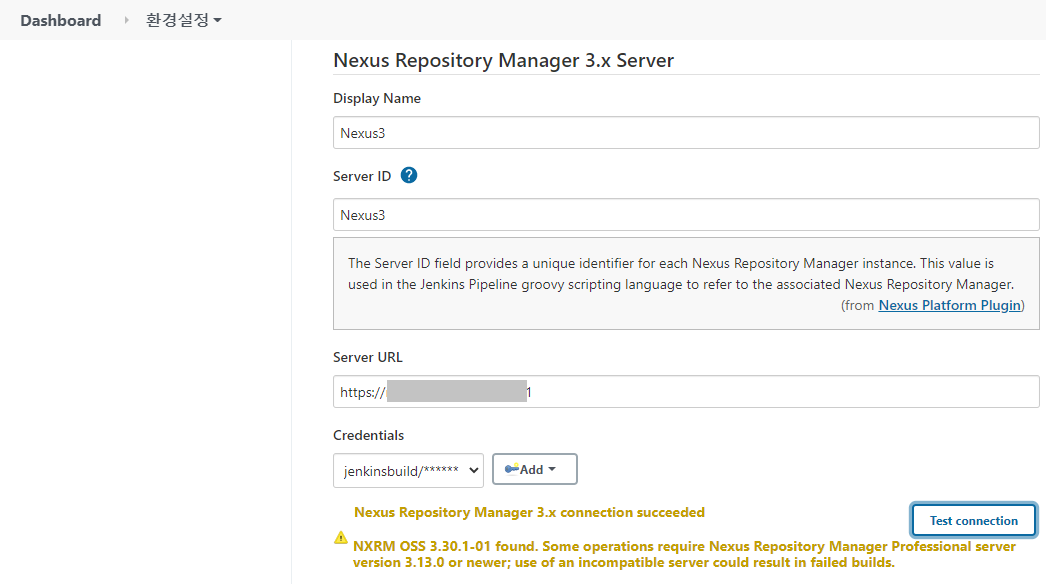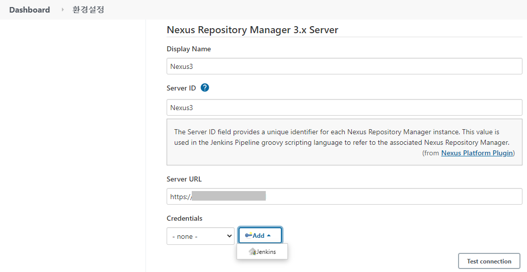 - Server URL - 연결할 Nexus3의 주소를 https://Nexus3주소:포트 또는 http://Nexus3주소:포트 형태로 입력한다.