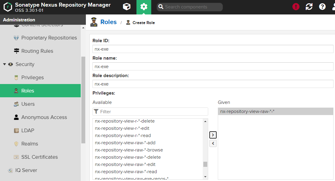 - Privileges - 각 저장소별 권한을 부여한다. raw 타입의 exe-repos 저장소를 사용한다.
