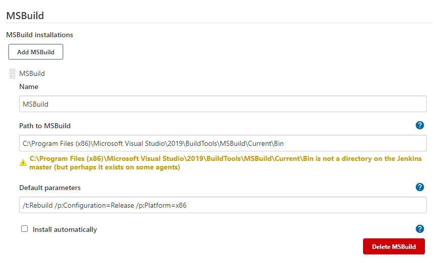 - Path to MSBuild - 윈도우 빌드 에이전트에 설치한 Visual Studio의 MSBuild.exe 파일의 폴더 경로를 입력한다. 파일명은 제외한다.
