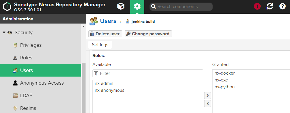 Nexus에서는 저장소별 작업 권한을 Role이라는 그룹으로 묶어서 관리한다.