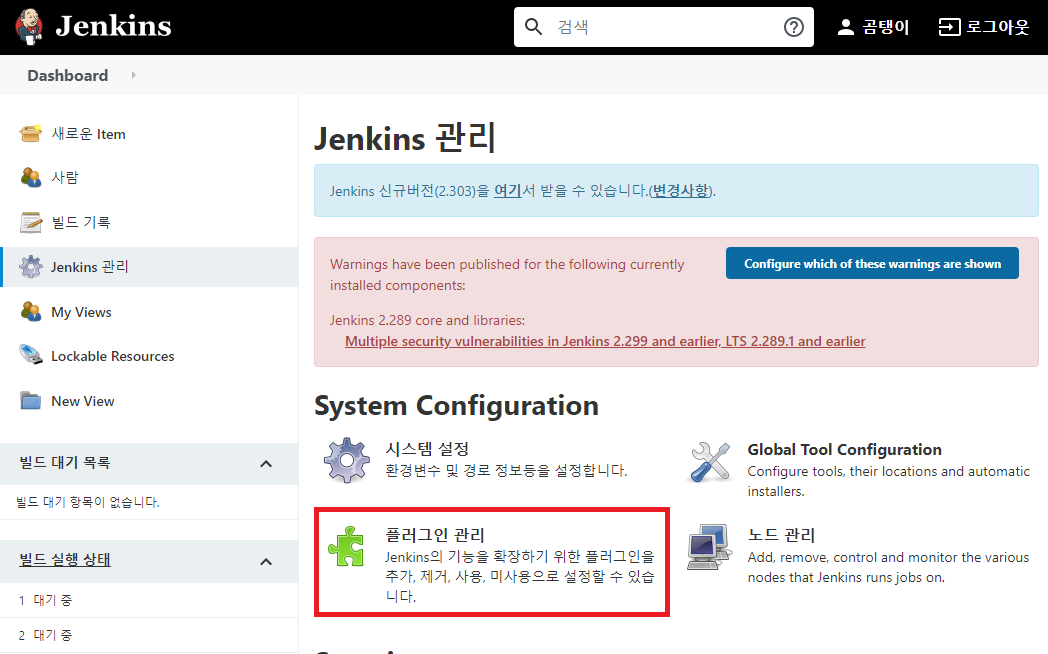 플러그인을 설치하기 위해서는 Jenkins 관리 - 플러그인 관리를 클릭한다.