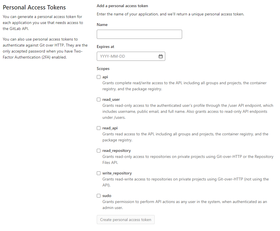 - Scopes - 권한을 지정한다. api, read_api, read_repository, write_repository, sudo에 체크했다.