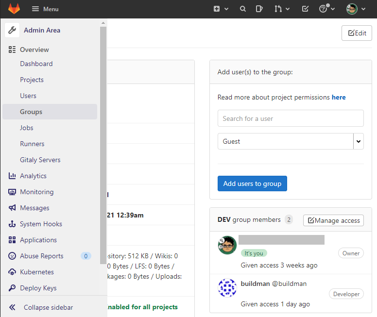 생성한 buildman 계정에 Jenkins에서 빌드할 Group이나 Project에 대한 권한을 부여한다.