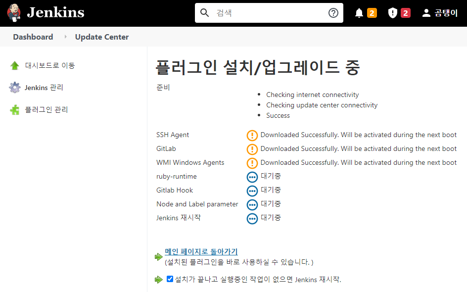 설치가 진행된다. 설치 후 Jenkins 재시작을 원하는 경우 제일 하단의 옵션을 체크한다.