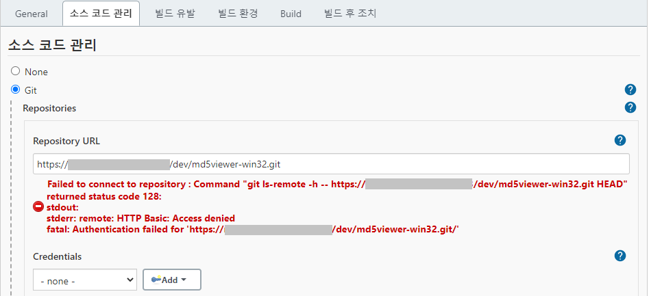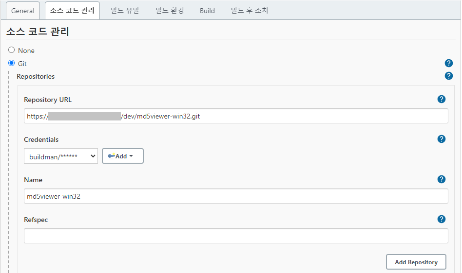 Credentials의 -none-을 클릭하고 기존에 추가한 buildman 계정을 선택한다.