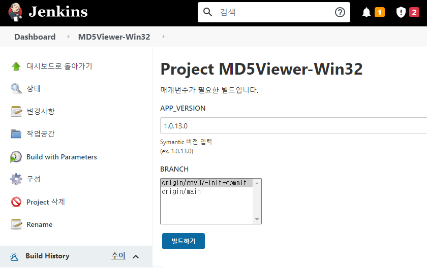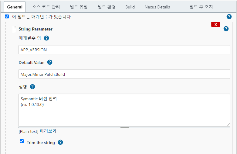 우측에 빌드 생성에서 General 탭에 구성한 Parameter 항목이 표시된다.