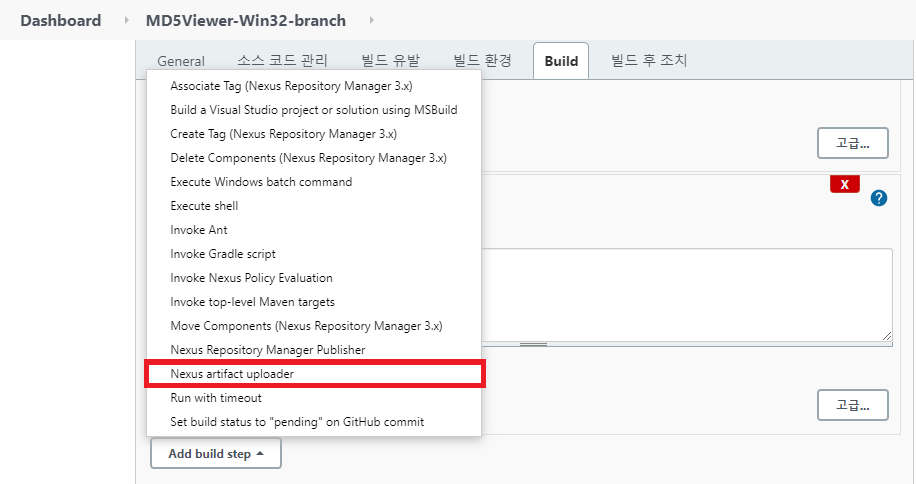 Build 탭에서 Add build step을 클릭하고 Nexus artifact uploader를 선택한다.