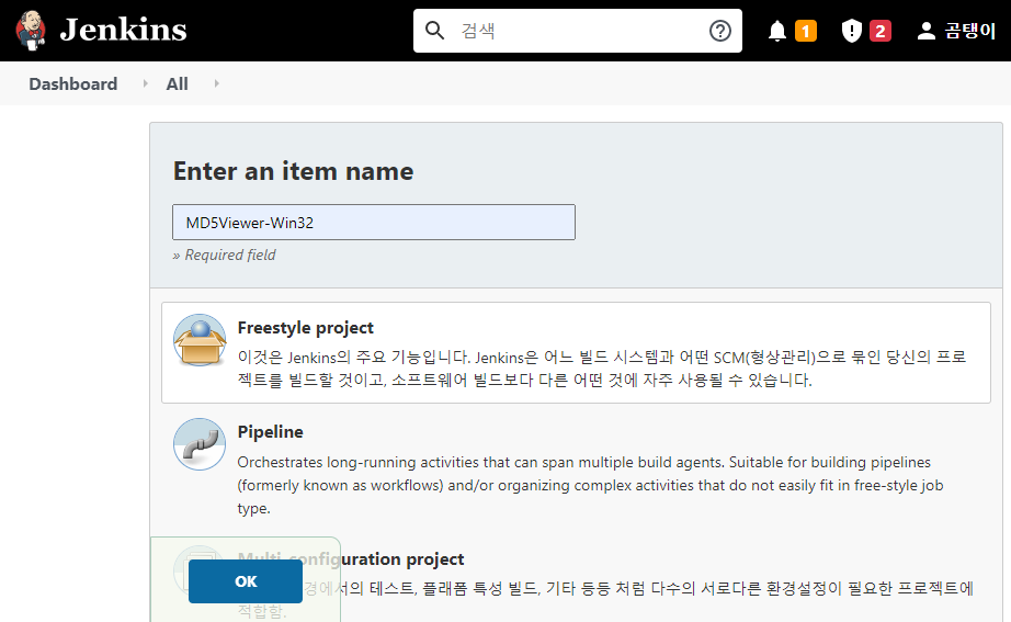 빌드 이름을 입력하고 Freestyle project를 선택한다.