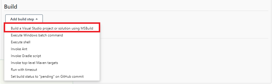 Add build step을 클릭하고 Build a Visual Studio project or solution using MSBuild를 선택한다.