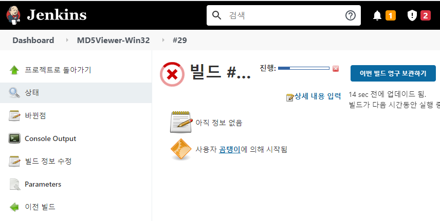 좌측 하단의 #빌드번호를 클릭하면 진행 중인 빌드의 상세 페이지로 이동한다.