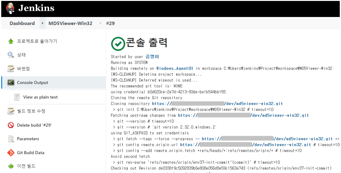 좌측의 Console Output을 클릭하면 빌드 과정에 대한 로그를 확인할 수 있다.