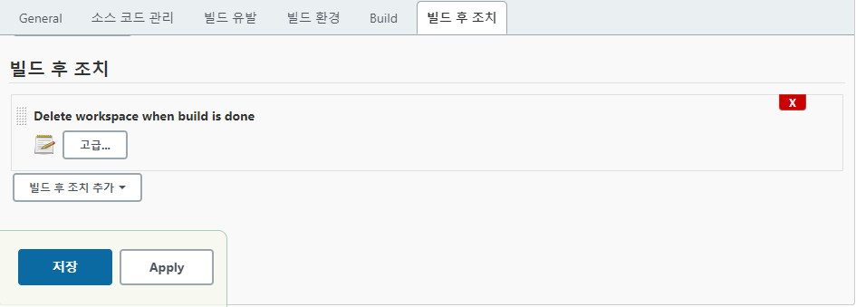 빌드 후 조치 추가 - Delete workspace when build is done을 선택한다.