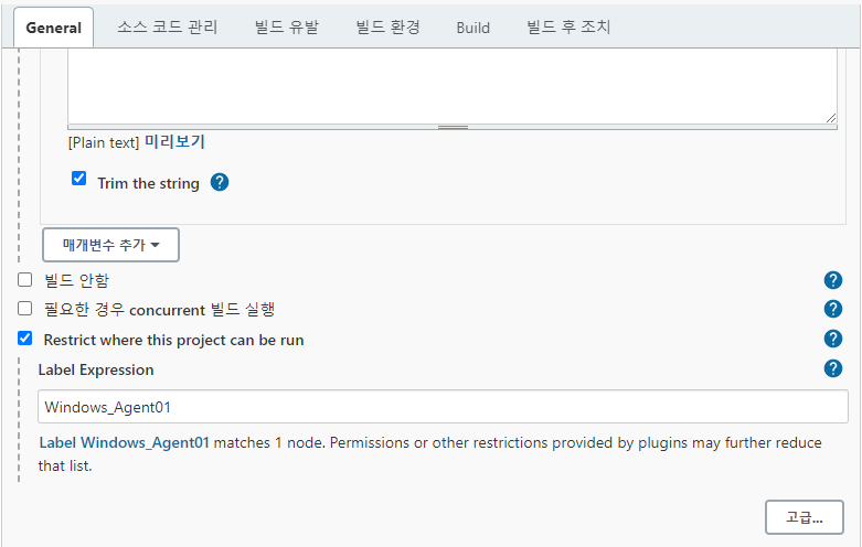 Restrict where this project can be run에 체크하고, 기존에 생성한 윈도우 빌드 에이전트의 Label을 입력한다.