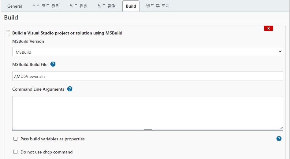 - MSBuild Build File - MSBuild로 빌드할 솔루션이나 프로젝트 파일 경로를 지정한다. 확장명까지 모두 입력해야 한다.