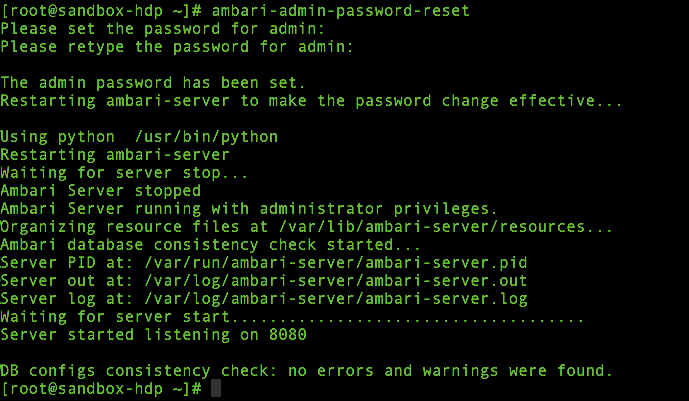 - ambari-admin-password-reset 명령을 실행하고, 새로운 admin 계정의 비밀번호를 입력한다.