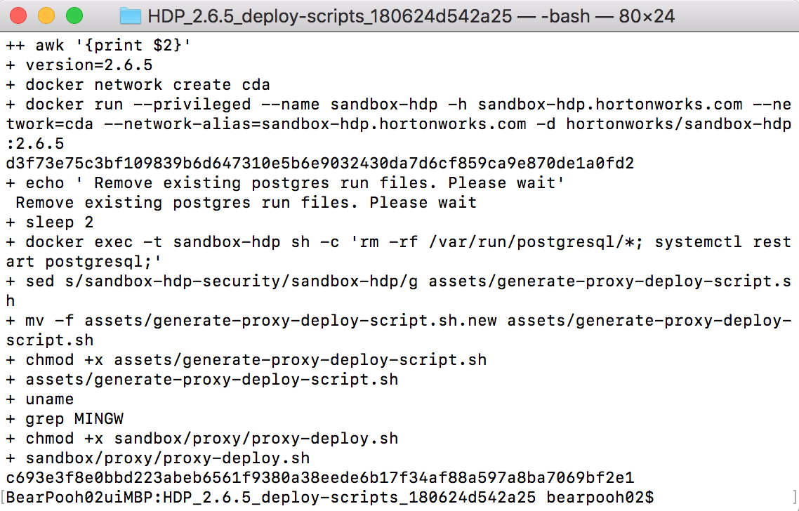 이 파일은 Sandbox HDP와 Sandbox Proxy Docker 이미지를 다운로드하고 컨테이너로 실행하는 기능을 수행한다.