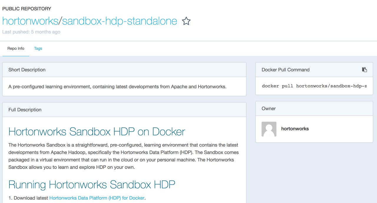 Docker Hub에서 sandbox-hdp-standalone으로 검색해보면 해당 Docker 이미지를 찾을 수 있다.
