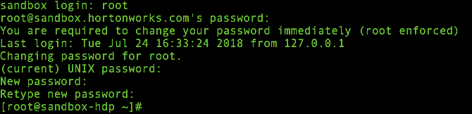 # 아래 명령으로 접속하고 기존 비밀번호로 로그인한다. $ ssh root@sandbox.hortonworks.com -p 2222 # 각 항목은 다음을 의미한다. # root@sandbox.hortonworks.com - 접속하려는 HDP Sandbox의 계정과 URL # -p 2222 - SSH 포트번호 # root 계정 비밀번호를 변경한다. $ passwd root # 각 항목은 다음을 의미한다. # passwd - 비밀번호 변경