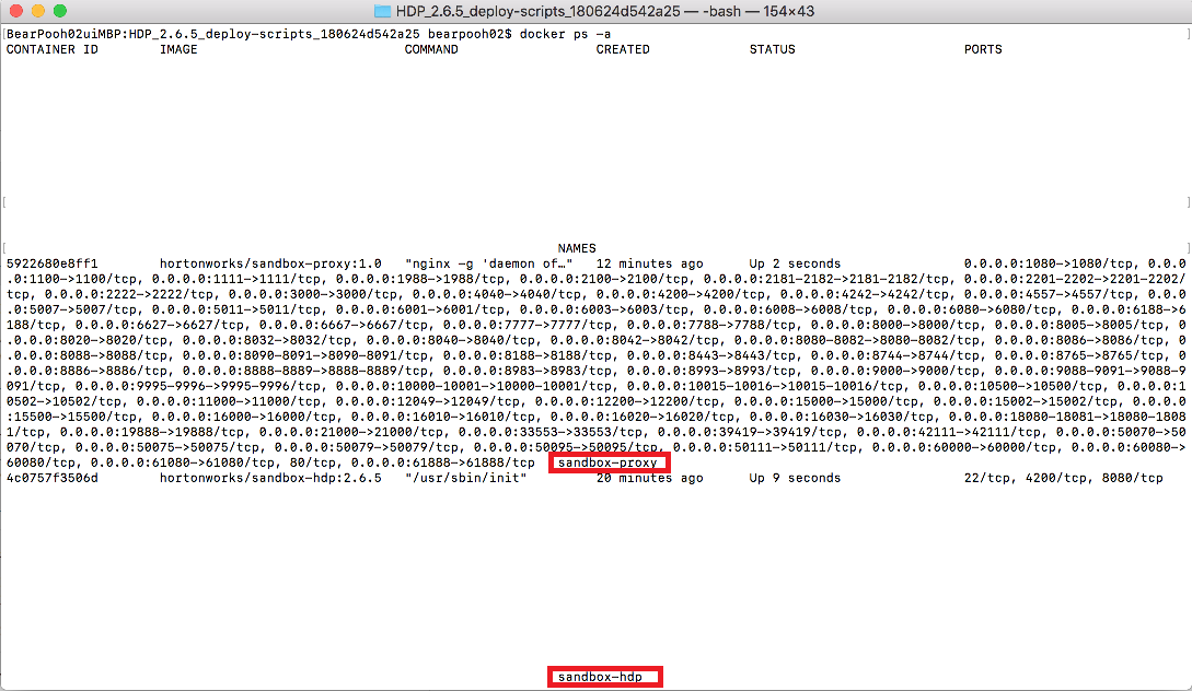 아래 명령어를 입력해서 HDP 컨테이너가 정상적으로 실행 중인지 확인한다. sandbox-proxy, sandbox-hdp 컨테이너가 실행 중이어야 한다.
