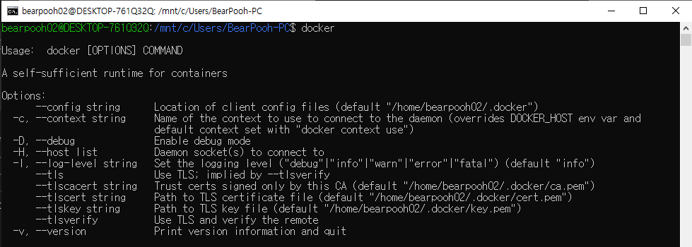 설치 완료 후 docker 명령을 실행하면 docker 도움말이 출력된다.