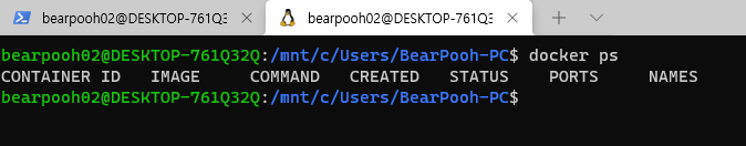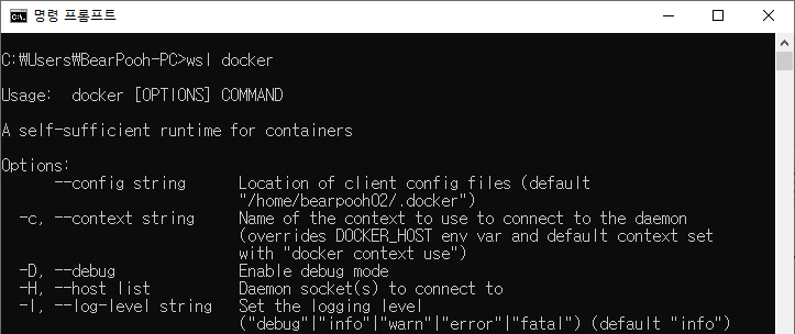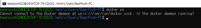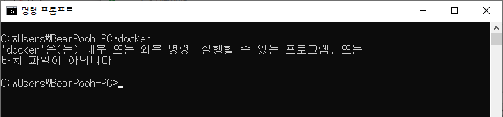 docker 데몬은 WSL로 Ubuntu 환경에서 실행 중이기 때문에, 윈도우 명령 프롬프트에서 사용이 불가능하다.