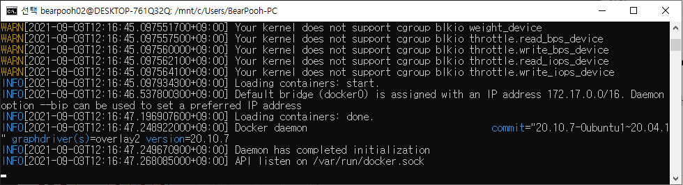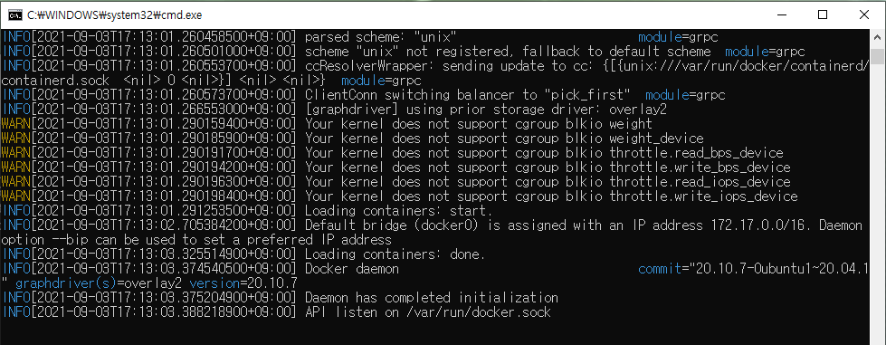 다음 명령으로 docker 데몬을 실행해 본다.