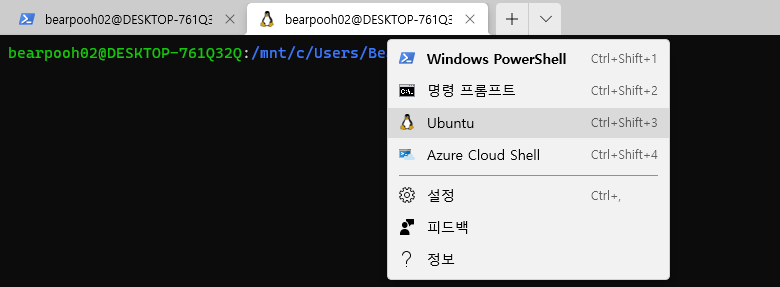 powershell 창에서 Ubuntu 탭을 선택해도 가능하다.