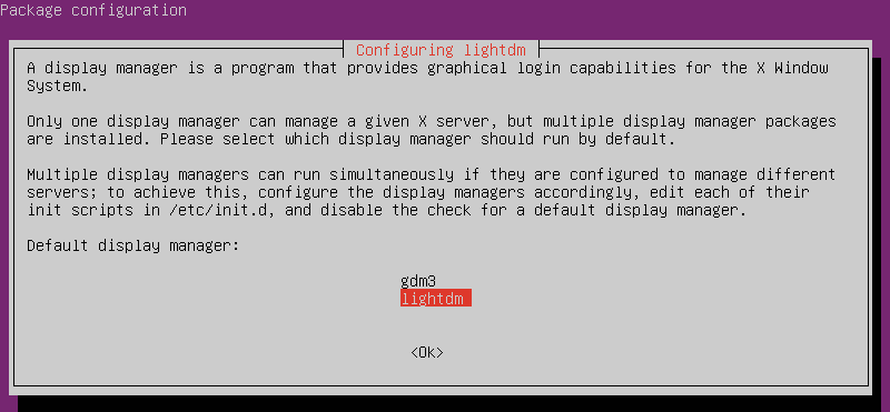 설치 도중 gdm3와 lightdm을 고르라는 메시지가 출력되는데 lightdm을 선택한다.