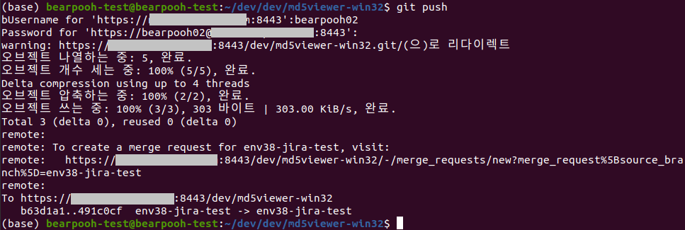 git commit 명령으로 Commit한다. Commit Message에 #JIRA이슈번호를 추가한다. (ex. #ENV-38)
