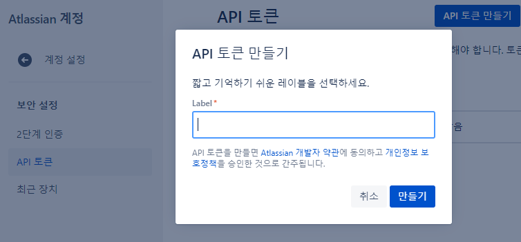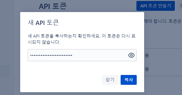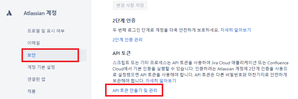 - 따라서 비밀번호를 입력할 수 없으므로 Atlassian의 계정 정보 설정에서 API token을 생성해야 한다.